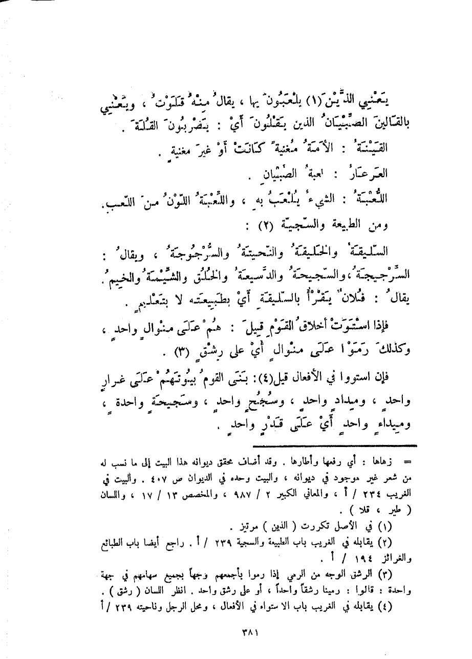 فإن استووا في الأفعال قيل: بنى القوم بيوتهم على غرارٍ واحدٍ، ومدادٍ واحدٍ، وسجيحٍ واحدٍ، وسجيحةٍ واحدةٍ، وميداءٍ واحدٍ أي على قدرٍ واحدٍ.