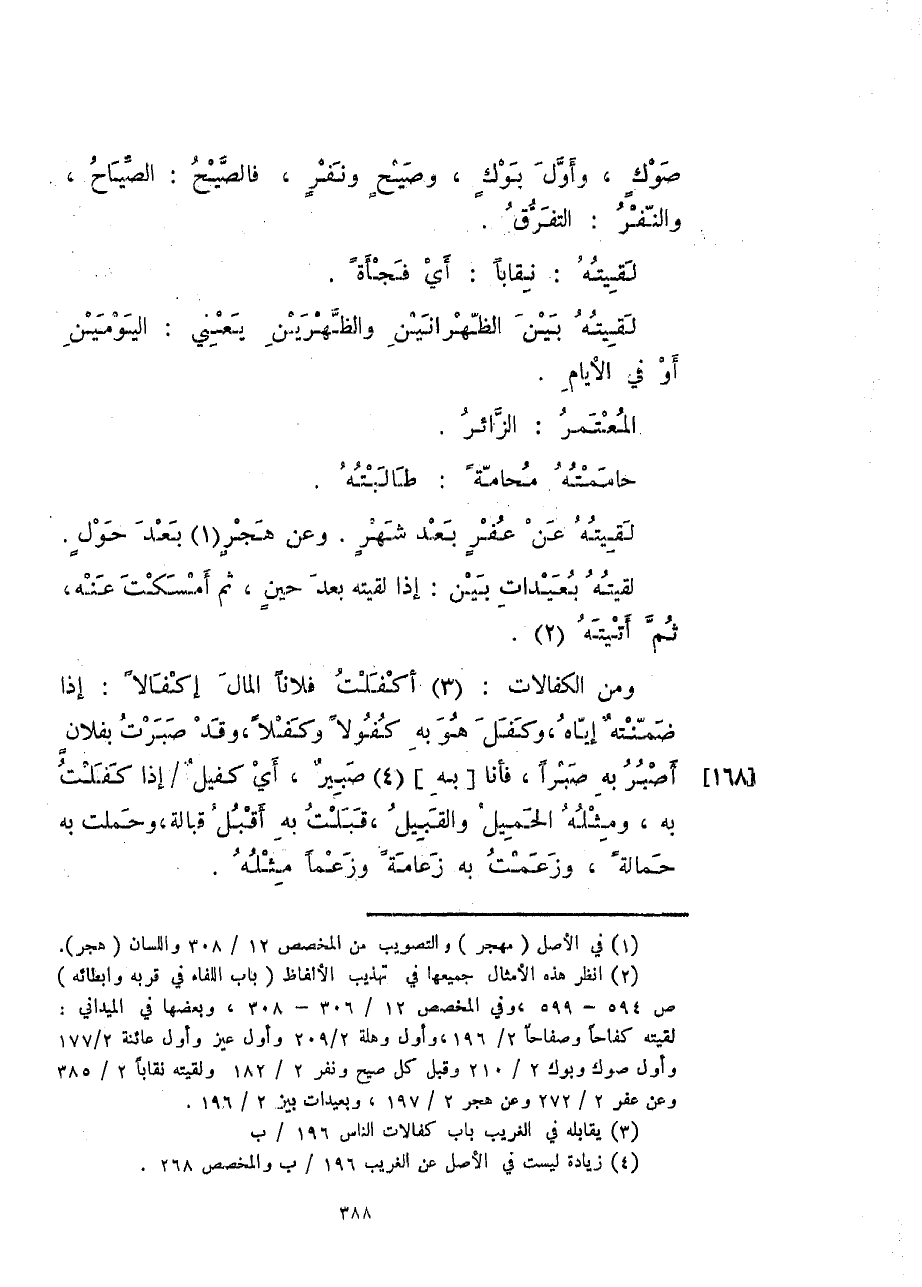 ومن الكفالات: أكفلت فلاناً المال إكفالاً: إذا ضمّنته إياه، وكفل هو به كفولاً وكفلاً، وقد صبرت بفلانٍ أصبر به صبراً، فأنا به صبيرٌ، أي كفيلٌ إذا كفلت به، ومثله الحميل والقبيل، قبلت به أقبل قبالة، وحملت به حمالةً، وزعمت به زعامةً وزعماً مثاه.