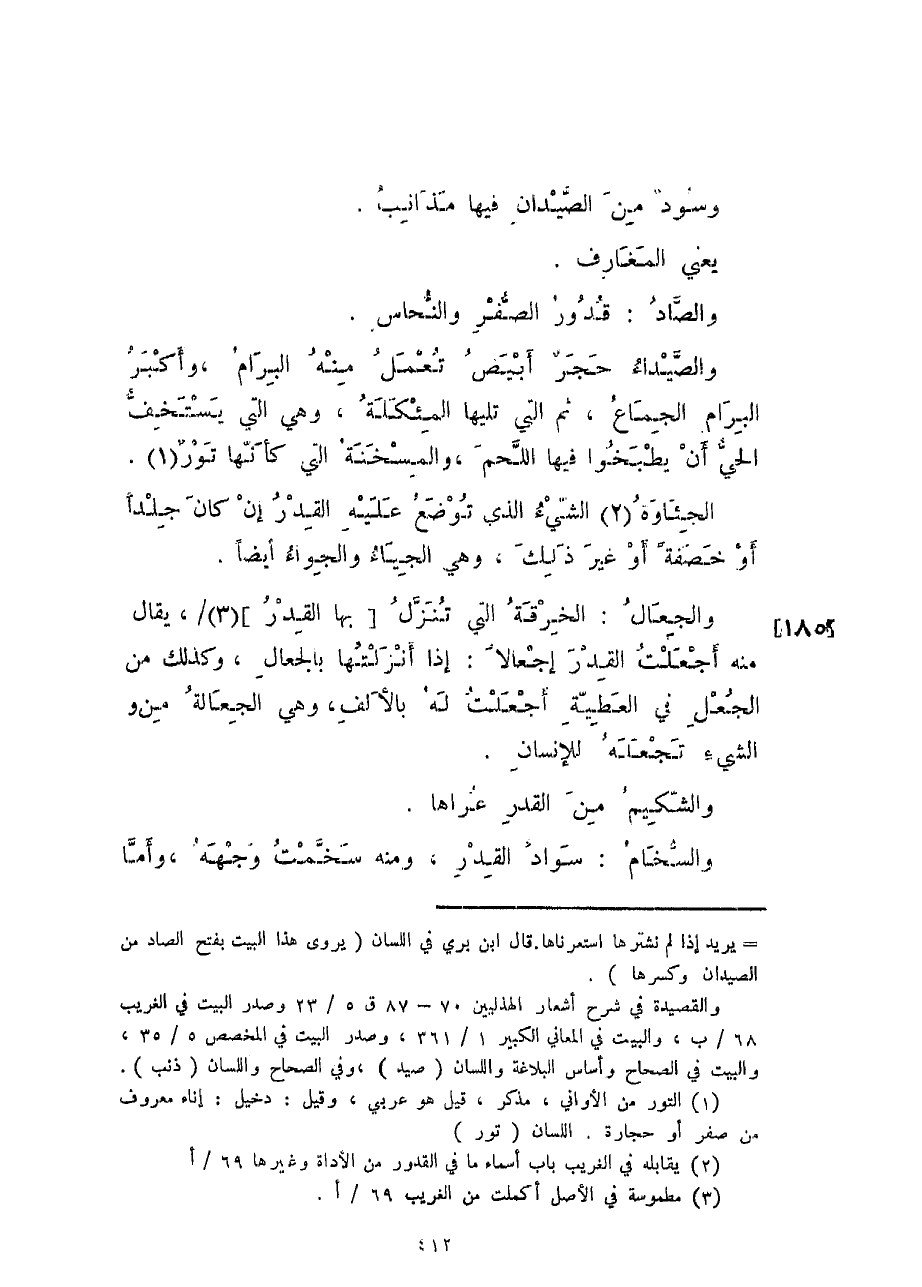 والصّيداء: حجرٌ أبيض تعمل منه البرام، وأكبر البرام الجماع، ثم التي تليها المئكلة، وهي التي يستخفّ الحيّ أن يطبخوا فيها اللحم، والمسخنة التي كأنها تورٌ.