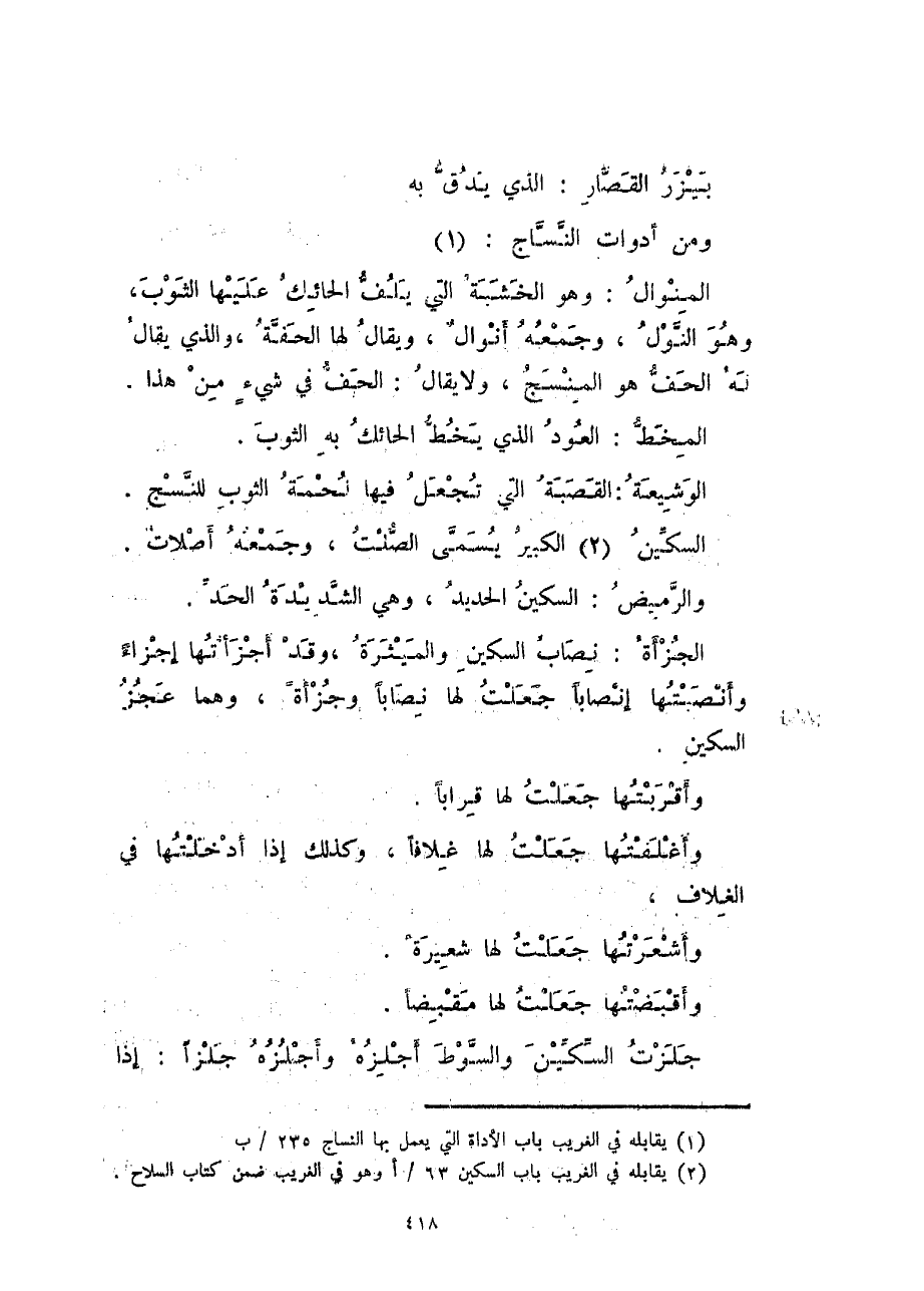 ومن أدوات النسّاج: المنوال: وهو الخشبة التي يلف الحائك عليها الثوب، وهو النّول، وجمعه أنوالٌ، ويقال لها الحفّة، والذي يقال له الحفّ هو المنسج، ولا يقال: الحفُّ في شيءٍ من هذا.