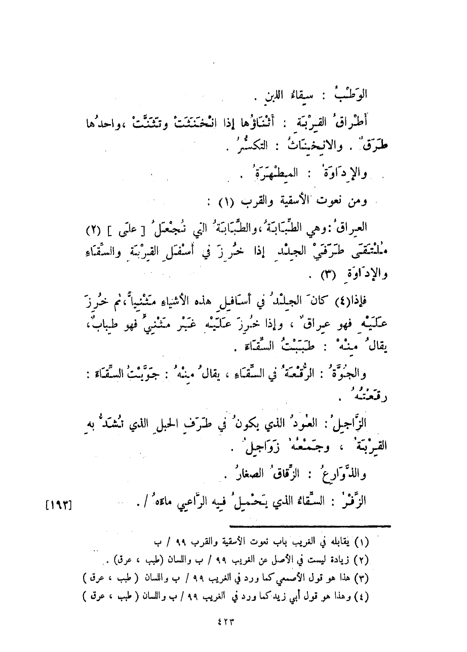 فإذا كان الجلد في أسافل هذه الأشياء مثنياً، ثم خرز عليه فهو عراقٌ، وإذا خرز عليه غير مثنيٍّ فهو طبابٌ، يقال منه: طببت السّقاء.