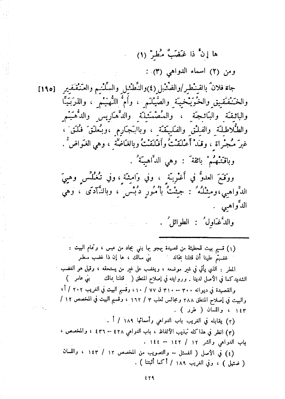 جاء فلانٌ بالقنطروالضئبل والنطئل والسلتم والعنقفير والخنفقيق والخويخية والصّيلم، وأمّ اللهيم، والذربيا والبائقة والبائجة، والمصمئلة والدهاريس والدّهيم والطّلاطلة والفلق والفليقة، وبالبجارم، وبعلق فلق، غير مجراةٍ، وقد أعلقت وأفلقت وبالغاضّة، وهي الغواضّ.