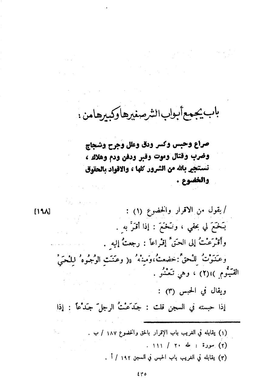 صراع وحبس وكسر ودق وعلل وجرح وشجاج وضرب وقتال وموت وقبر ودفن ودم وهلاك، نستجير بالله من الشرور كلها، والأقواد بالحقوق والخضوع.