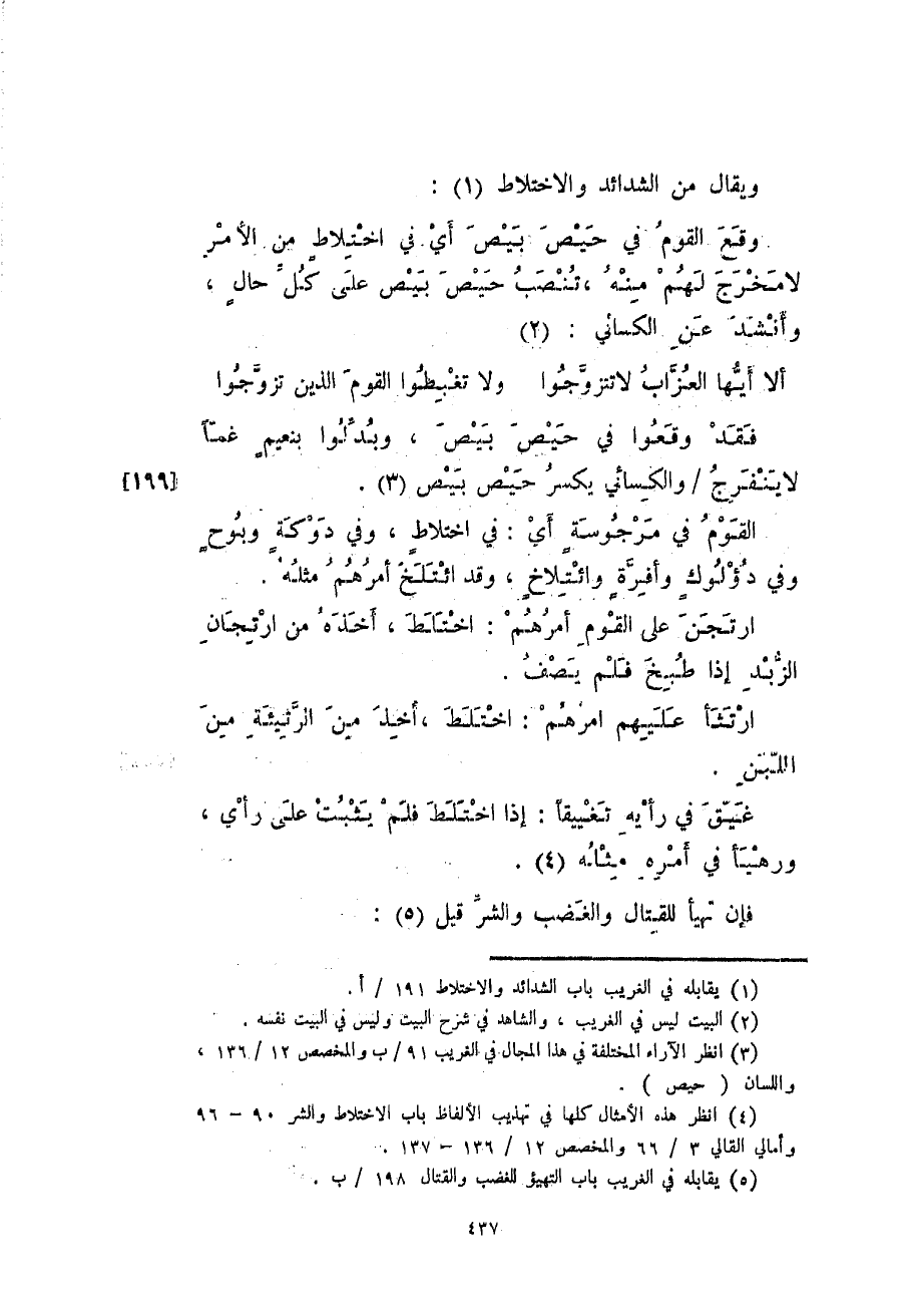 ويقال من الشدائد والاختلاط: وقع القوم في حيص بيص أي في اختلاطٍ من الأمر لا مخرج لهم منه، تنصب حيص بيص على كل حالٍ، وأنشد عن الكسائي:
