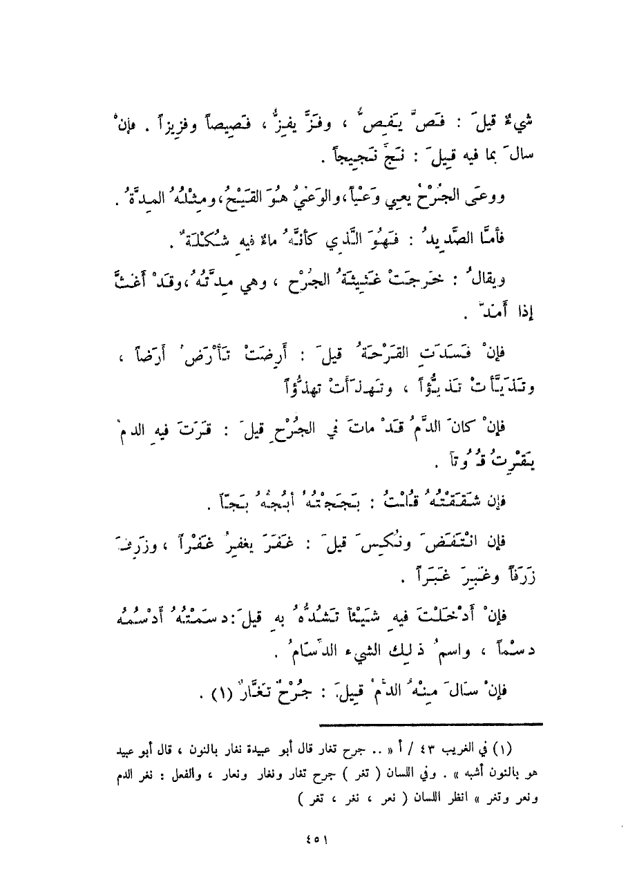 شيءٌ قيل: فصّ يفصّ، وفزّ يفزّ، فصيصاً وفزيزاً. فإن سال بما فيه قيل: نجّ نجيجاً.