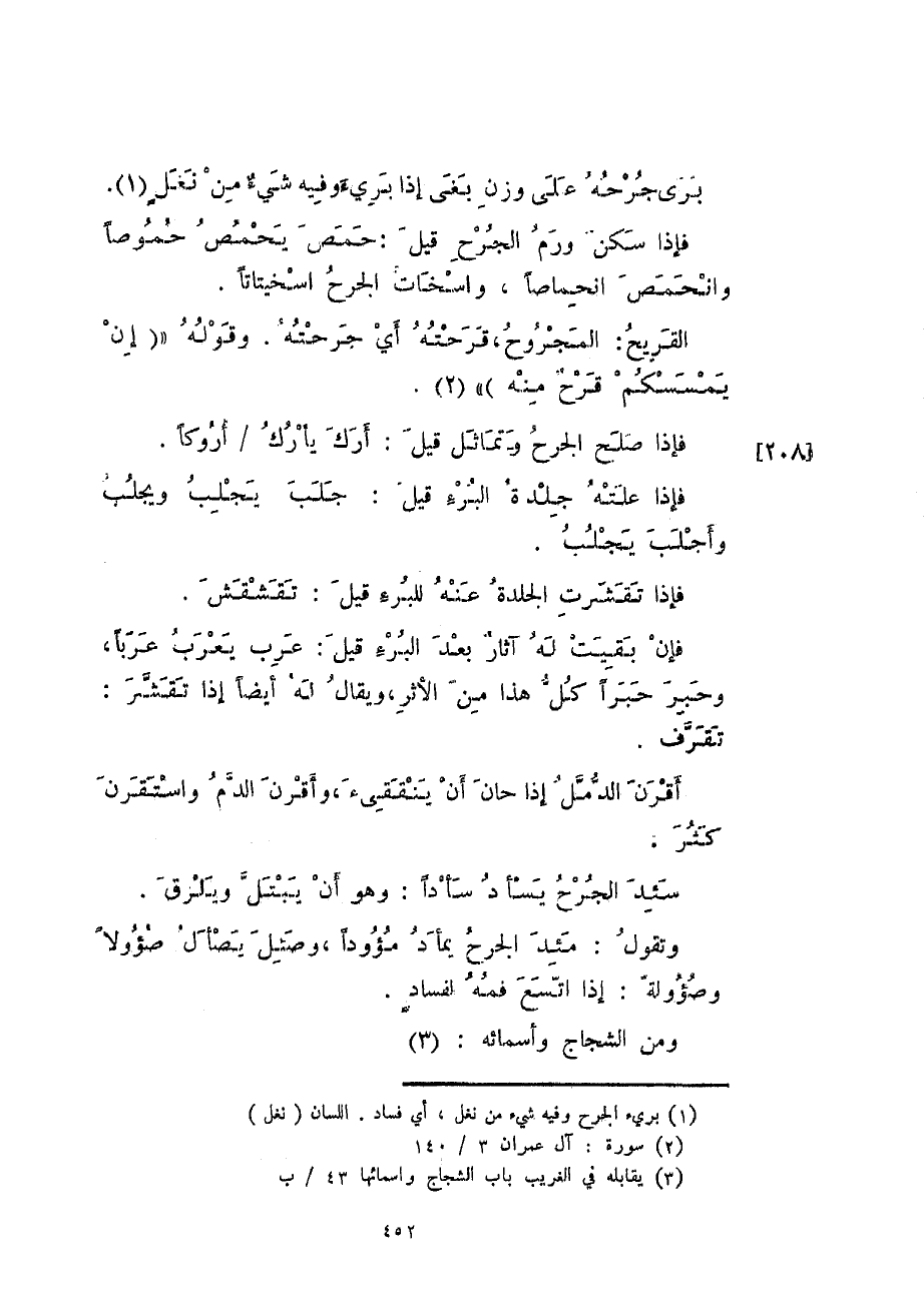 فإن بقيت له آثارٌ بعد البرء قيل: عرب يعرب عرباً، وحبر حبراً كل هذا من الأثر، ويقال له أيضاً إذا تقشر: تقرّف.