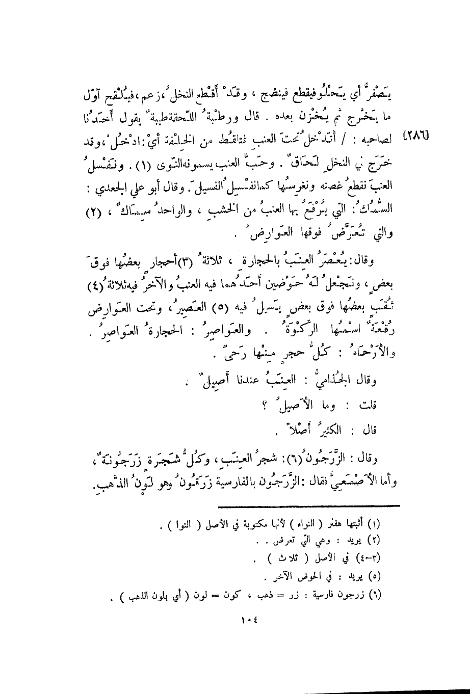 يصفر أي يحلو فيقطع فينضج، وقد اقطع النخل، زعم، فيلقح أول ما يخرج ثم تخزن بعده. قال ورطبة اللحقة يقول أحدنا لصاحبه: أتدخل تحت العنب فتلقط من الخلفة أي: ادخل، وقد خرج في النخل لحاق. وحب العنب يسمونه النوى. ونفسل العنب نقطع غصنه قم نغرسها كما نفسل الفسيل. وقال أبو علي الجعدي: السمك: التي يرفع بها العنب من الخشب، والواحد سماك، والتي تعرض فوقها العوارض.
