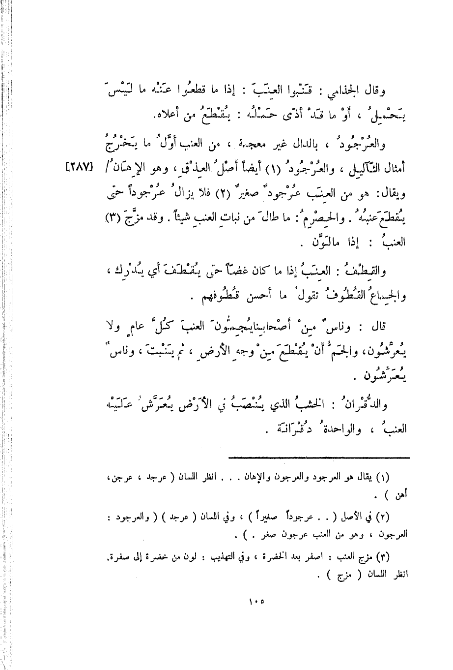 والعرجود: بالدال غير معجمة، من العنب أول ما يخرج أمثال الثآليلي، والعرجود أيضاً أصل العذق، وهو الإهان ويقال: هو من العنب عرجود صغير فلا يزال عرجوداً حتى يقطع عنبه. والحصرم: ما طال من نبات العنب شيئاً. وقد مزج العنب: إذا ما لون.