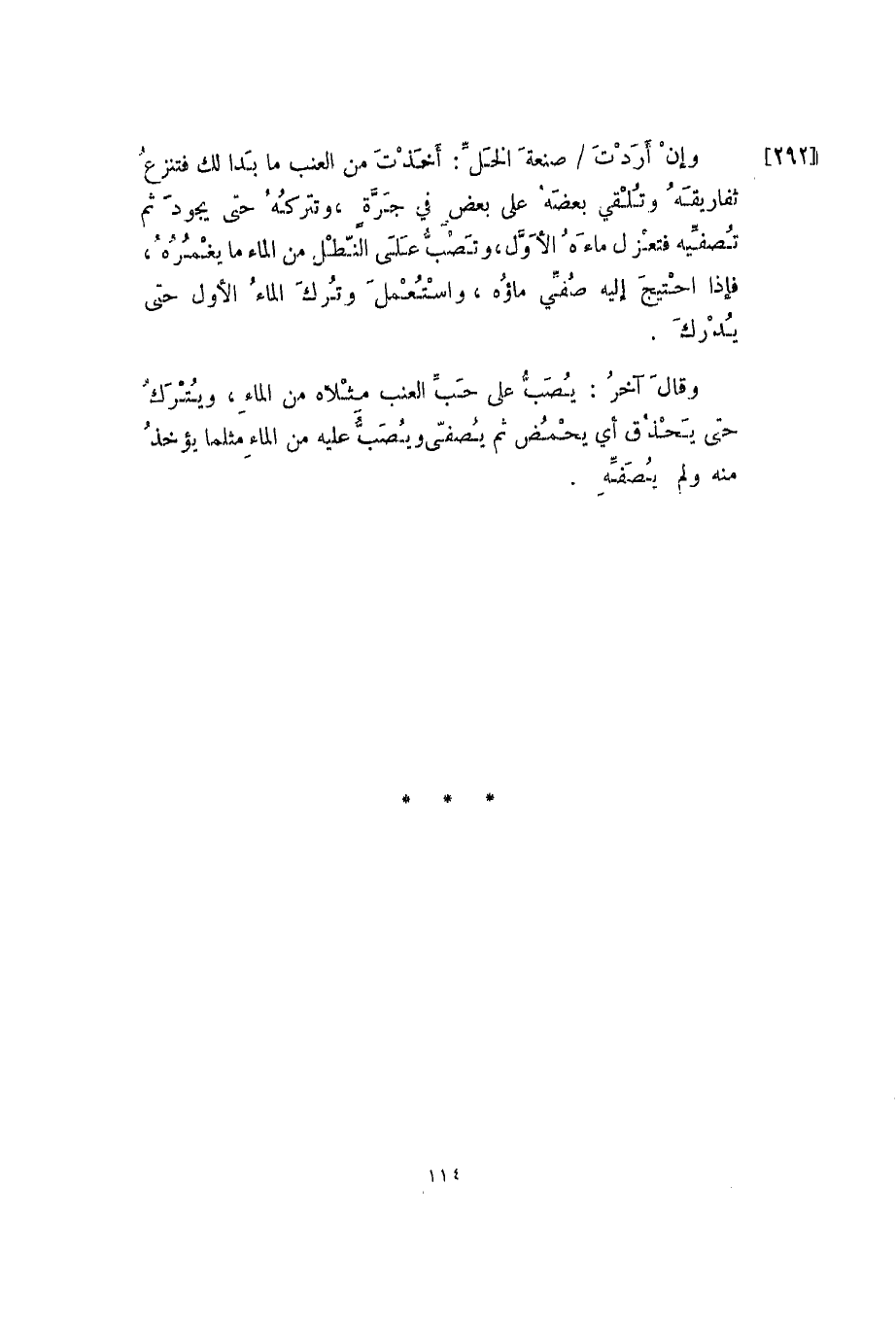 وقال آخر: يصب على حب العنب مثلاه من الماء، ويترك حتى يحذق أي يحمض ثم يصفى ويصب عليه الماء مثلما يؤخذ منه لم يصفه.