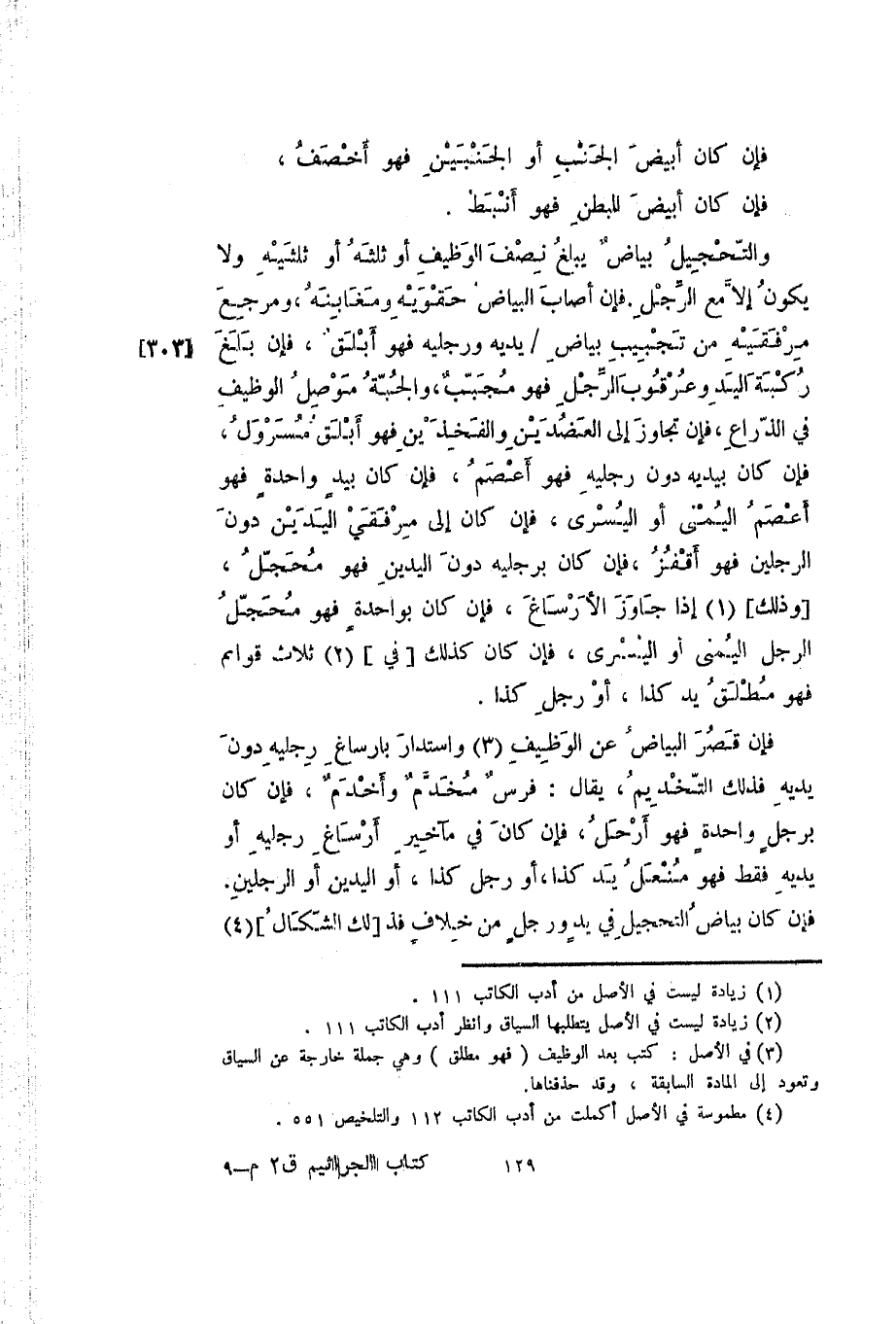 والتحجيل بياض يبلغ نصف الوظيف أو ثلثه أو ثلثيه ولا يكون إلا مع الرجل. فإن أصاب البياض حقويه ومغابنه، ومرجع مرفقيه من تجبيب بياض يديه ورجليه فهو أبلق، فإنبلغ ركبة اليد وعرقوب الرجل فهو مجبب، والجبة موصل الوظيف في الذراع، فإن تجاوز إلى العضدين والفخذين فهو أبلق مسرول، فإن كان بيديه دون رجليه فهو أعصم، فإن كان بيد واحدة فهو أعصم اليمنى أو اليسرى، فإن كان إلى مرفقي اليدين دون الرجلين فهو أقفز، فإن كان برجليه دون اليدين فهو محجل [وذلك] إذا جاوز الرساغ، فإن كان كذلك [في] ثلاث قوائم فهو مطلق يد كذا، أو رجل كذا.