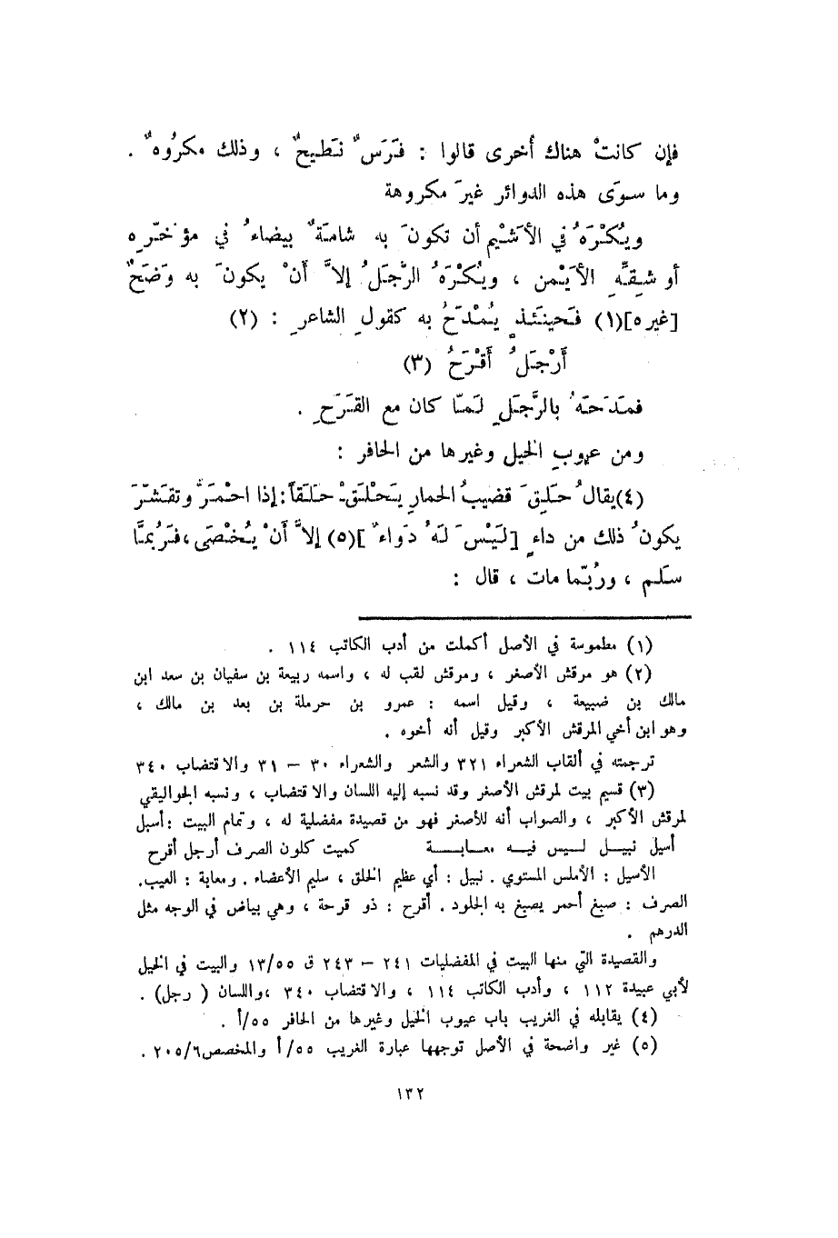 ويكره في الأشيم أن تكون به شامة بيضاء في مؤخره أو شقه الأيمن. ويكره الرجل إلا أن يكون به وضح [غيره] فحينئذ يمدح به كقول الشاعر:
