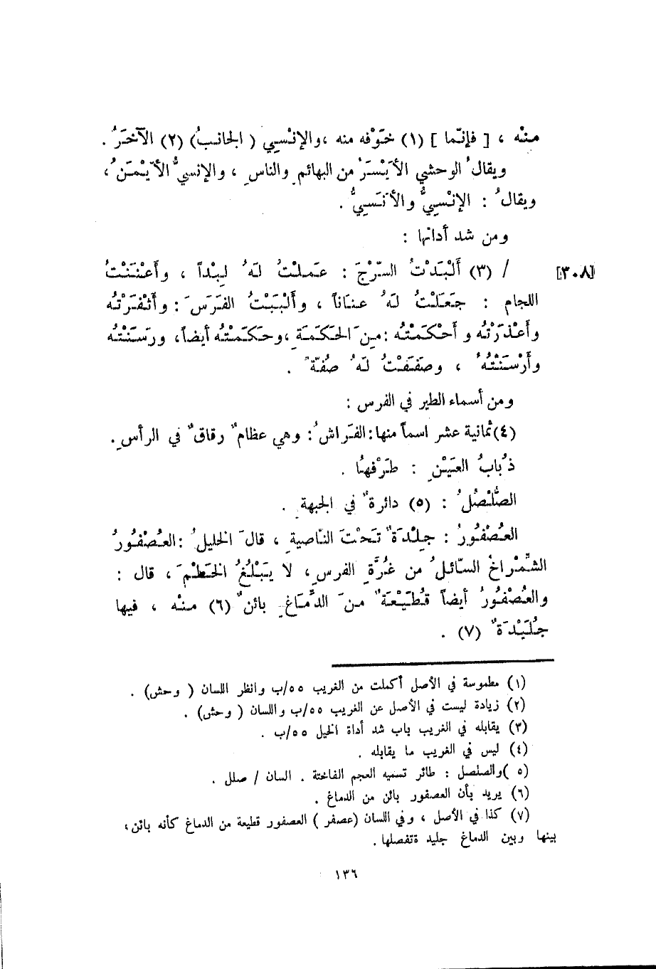 الصلصل: دائرة في الجبهة؟ العصفور: جلدة تحت الناصية، قال الخليل: العصفور الشمراخ السائل من غرة الفرس، لا يبلغ الخطم، قال: والعصفور أيضاً قطيعة من الدماغ بائن منه، فيها جليدة.