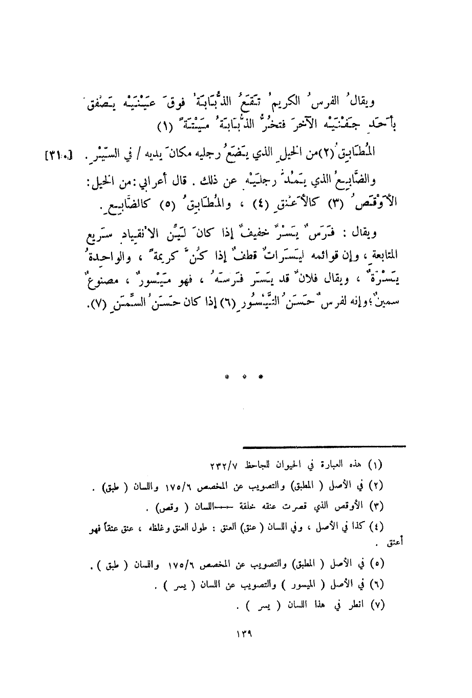 ويقال: فرس يسر خفيف إذا كان لين الانقياد سريع المتابعة، وإن قوائمه ليسرات قطف إذا كن كريمة، والواحدة يسرة، ويقال فلان قد يسر فرسه، فهو ميسور، مصنوع سمين، وإنه لفرس حسن التيسور إذا كان حسن السمن.
