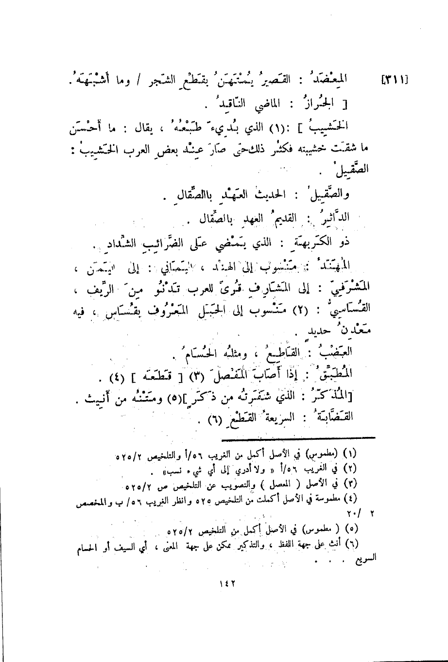 المهند: منسوب إلى الهند، اليماني: إلى اليمن، المشرفي: إلى المشارف قرى للعرب تدنو من الريف، القساسي: منسوب إلى الجبل المعروف بقساس، فيه معدن حديد.