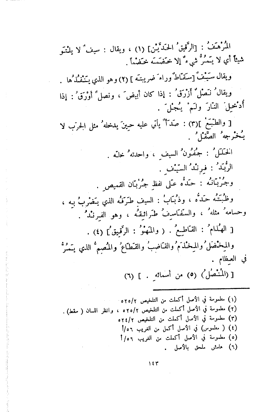 [الهذام: القاطع. (والمهو: الرقيق] والمخضل وزالمخدم والقاضب والقطاع والمصم الذي يمر في العظام.