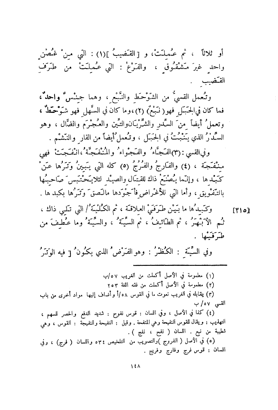 وتعمل القسي من الشوحط والنبع، وهما جنس واحد، فما كان من الجبل فهو (نبع) ، وما كان من السهل فهو شوحط، وتعمل أيضاً من السدر والشريان والتين والعجرم والضال، وهو السدر الذي ينبت في الجبل، وتعمل أيضاً من القار والنشم.