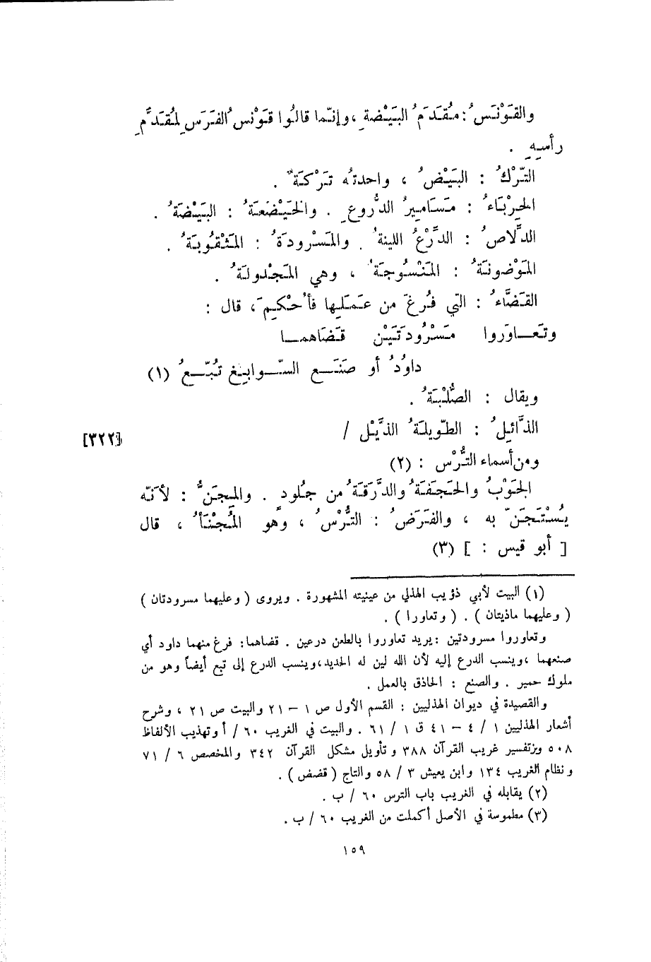 ومن أسماء الترس: الجوب والحجفة والدرقة من جلود. والمجن: لأنه يستجن به، والفرض: الترس، وهو المجنأ، قال [أبو قيس:]