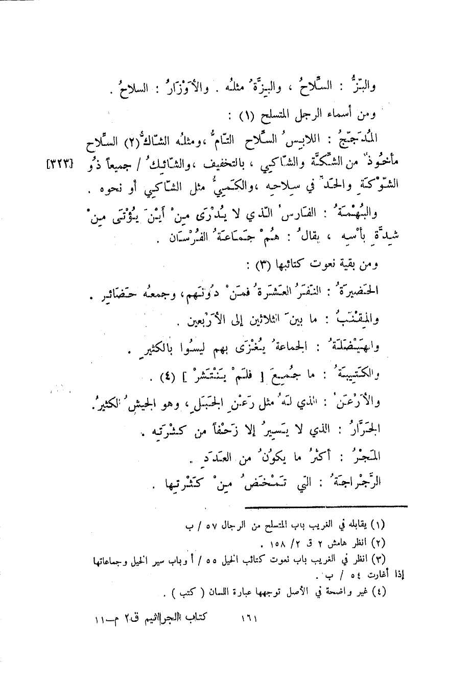 ومن أسماء الرجل المتسلح: المدجج: اللابس السلاح التام، ومثلة الشاك السلاح مأخوذ من الشكة والشاكي، بالتخفيف، والئاك جميعاً ذو الشوكة والحد في سلاحه، والكمي مثل الشاكي أو نحوه.