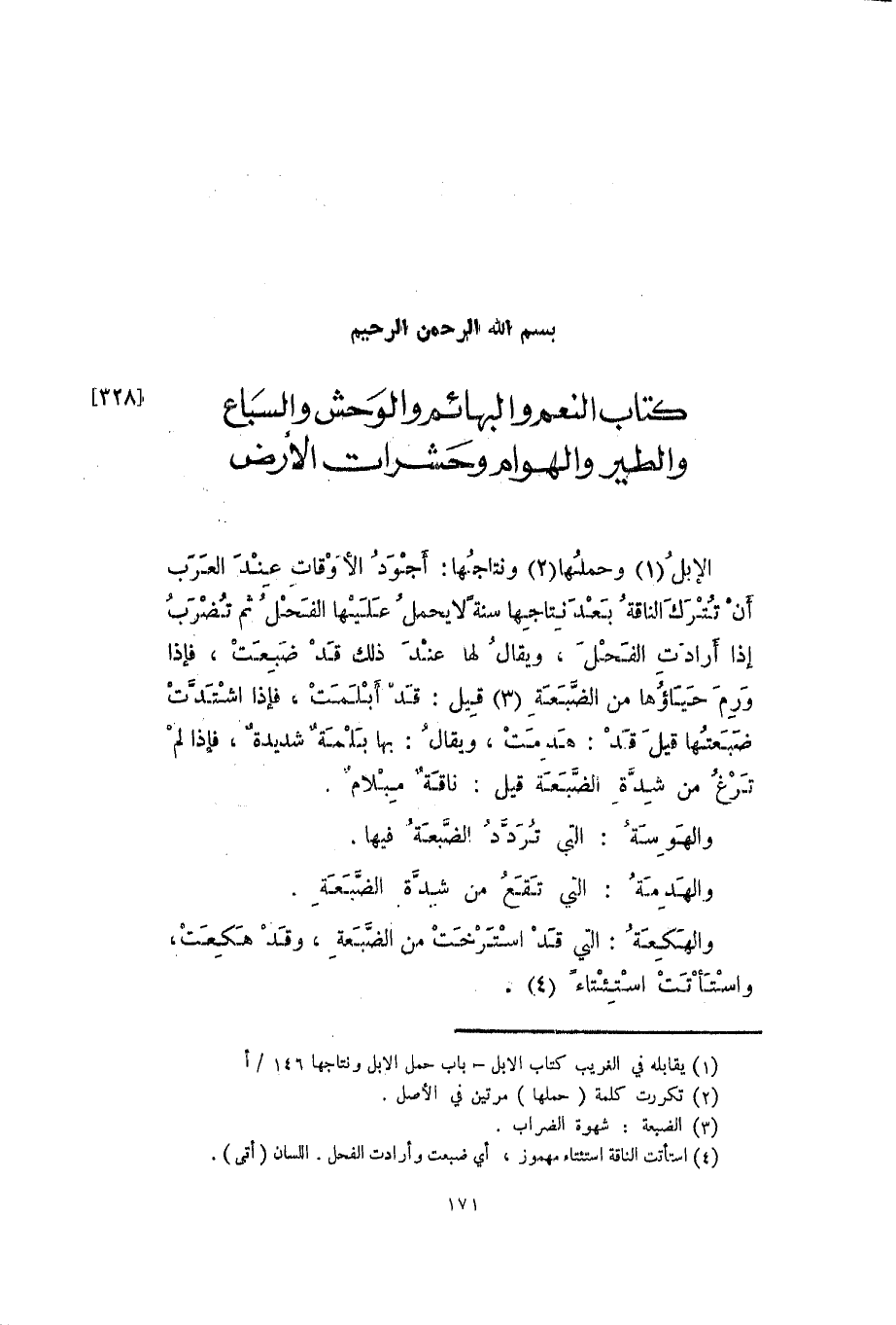 الإبل وحملها ونتاجها: أجود الأوقات عند العرب أن تترك الناقة بعد نتاجها سنة لا يحمل عليها الفحل ثم تضرب إذا أرادت الفحل، ويقال لها عند ذلك قد ضبعت، فإذا ورم حياؤها من الضبعة قيل: قد أبلمت، فإذا اشتدت ضبعتها قيل قد: هدمت، ويقال: بها بلمة شديدة، فإذا لم ترغ من شدة الضبعة قيل: ناقة مبلام.