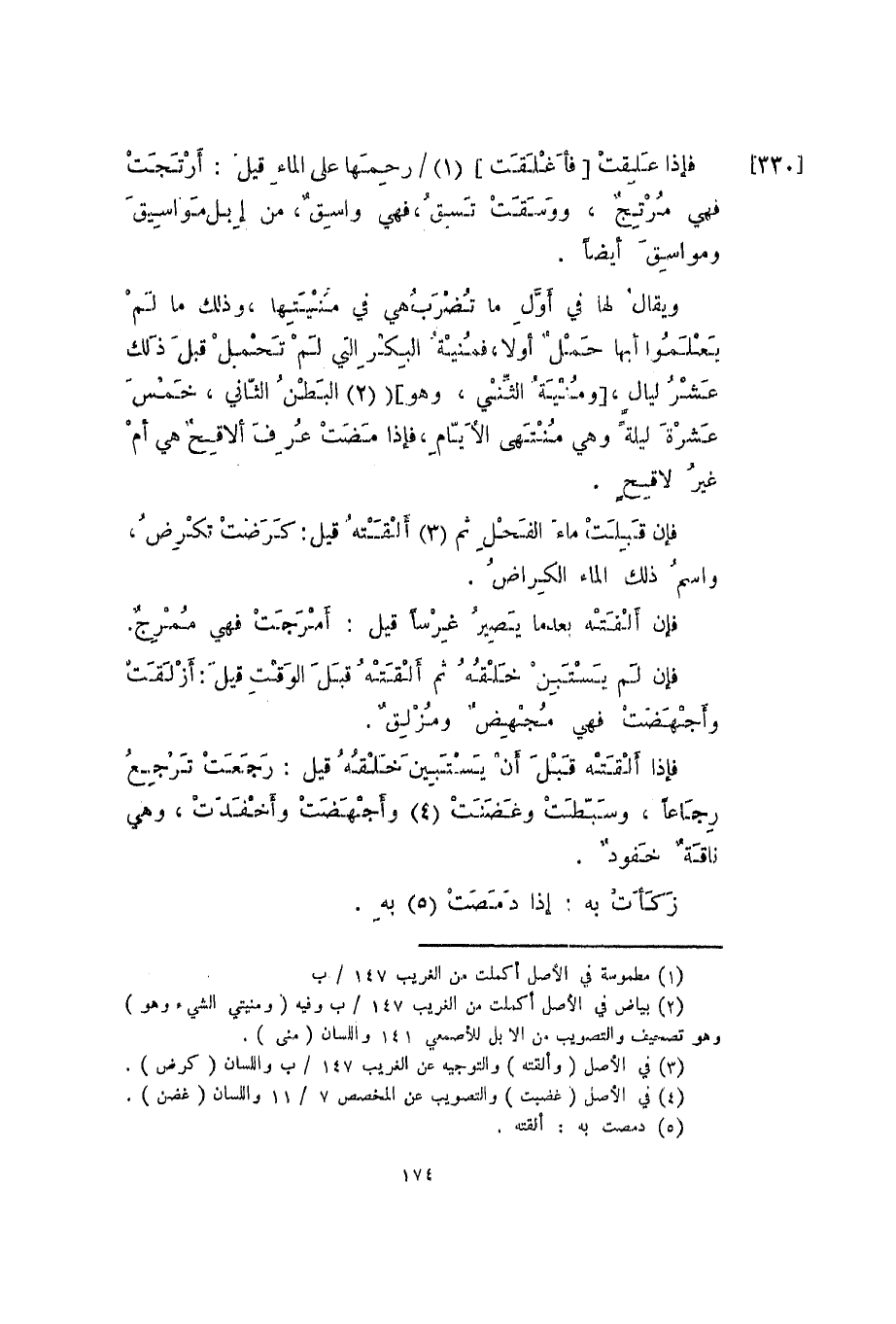 فإن علقت [فأغلقت] رحمعها على الماء قيل: ارتجت فهي مرتج، ووسقت تسق فهي واسق، من إبل مواسيسق ومواسق أيضاً.