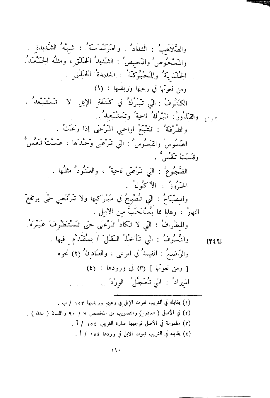 ومن نعوتها في رعيها وربضها: الكنوف: التي تبرك في كنفة الإبل ولا تستبعد. والقذور: تبرك ناحية وتستبعد.