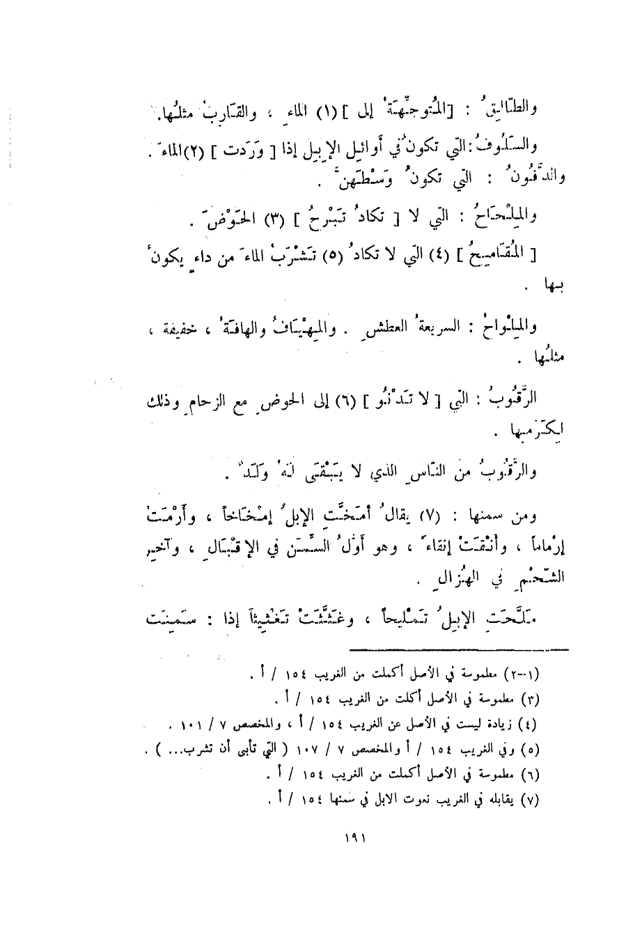 ومن سمنها: يقال أمخت الإبل إمخاخاً، وأرمت إرماماً، وأنقت إنقاء، وهو أول السمن في الإقبال، وآخر الشحم في الهزال.