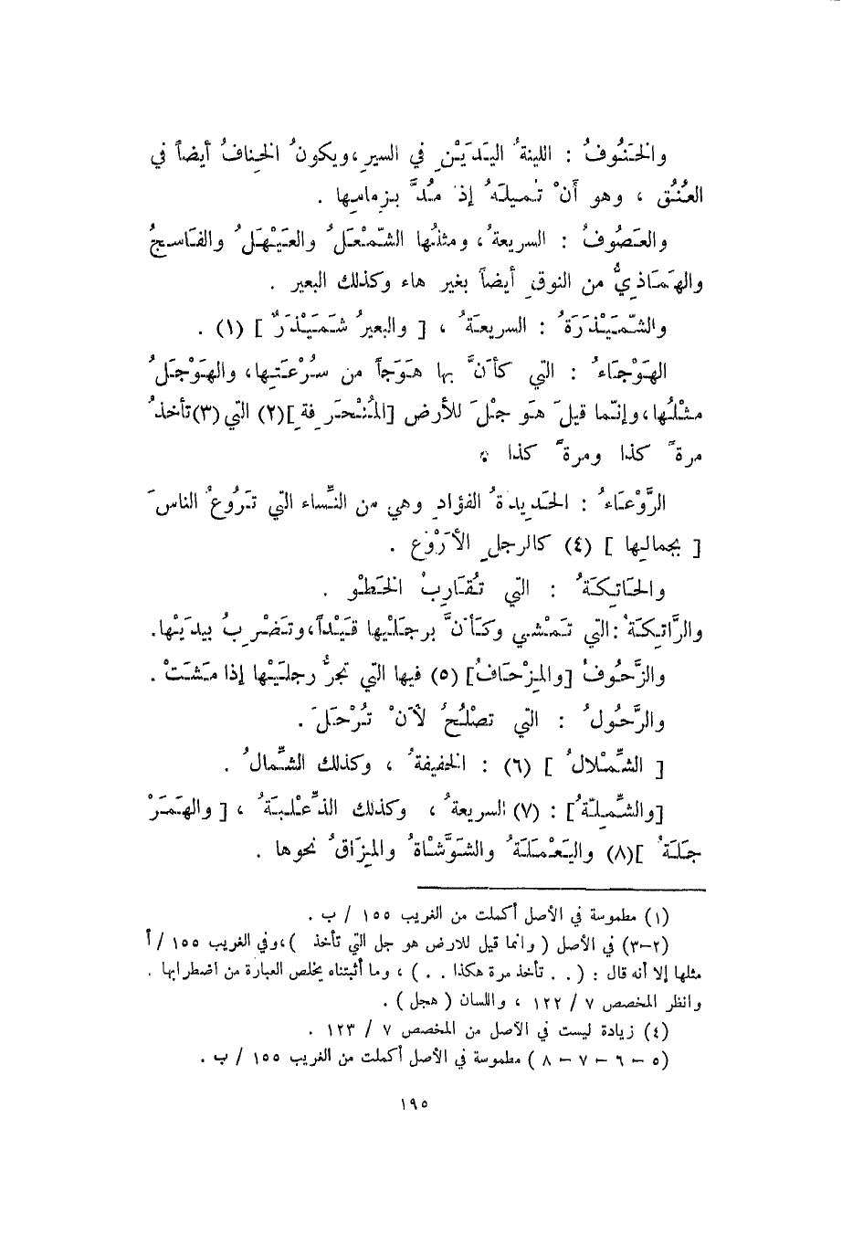 والعصوف: السريعة، ومثلها الشمعل والعيهل والفاسج والهماذي من النوق أيضاً بغير هاء وكذلك البعير.