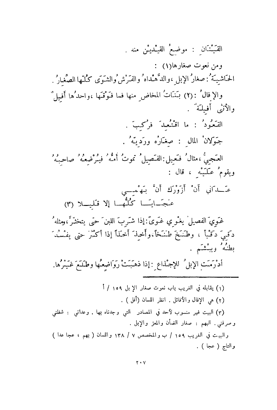 ومن نعوت صغارها: الحاشية: صغار الإبل، والدهداه والفرش والشوى كلها الصغار.
