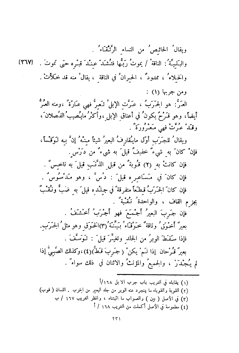 ومن جربها: العر: هو الجرب، عرت الإبل تعر فهي عارة، ومنه العر أيضاً، وهو قرح يكون في أعناق الإبل، وأكثر ما يصيب الفصلان، وقد عرت فهي معرورة.