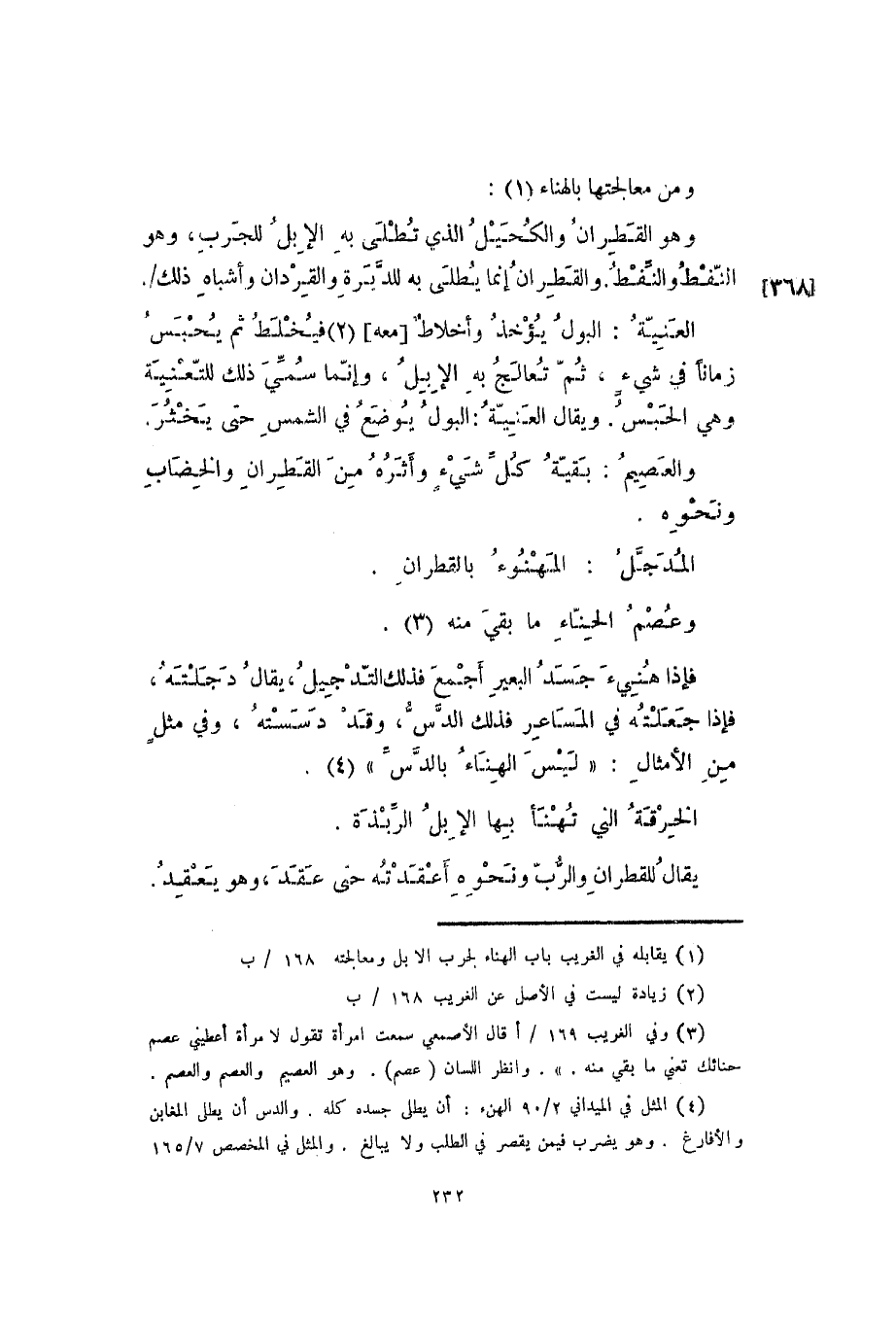 ومن معالجتها بالهناء: وهو القطران والكحيل الذي تطلى به الإبل للجرب، وهو النفط والنفط. والقطران إنما يطلى به للدبرة والقردان واشباه ذلك.