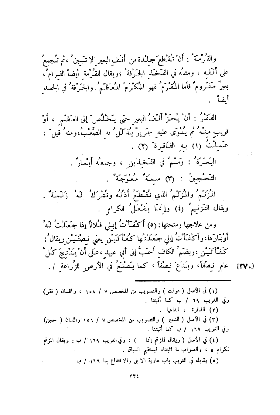 ومن علاجها ومنحتها: أكفأت إبلي فلاناً إذا جعلت له أوبارها، وأكفأت إبلي جعلتها كفأتين يعني نصفين ويقال: كفأتين، وبضم الكاف أحب إلى أبي عبدي على أن ينتج كل عام نصفاً، ويدع نصفاً، كما يصنع في الأرض للزراعة.