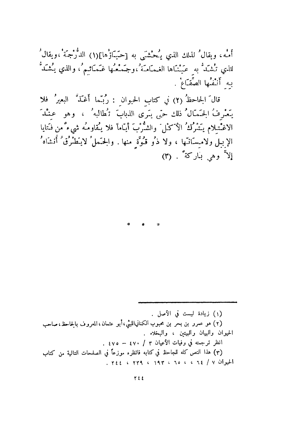 قال الجاحظ في كتاب الحيوان: ربما أغذ البعير فلا يعرف الجمال ذلك حتى يرى النباب تطالبه، وهو عند الاغتلام يترك الأكل والشرب أياماً فلا يقاومه شيء في فتايا الإبل ولا مسانها، ولا ذو قوة منها، والجمل لا يطرق أنثاه إلا وهي باركة.