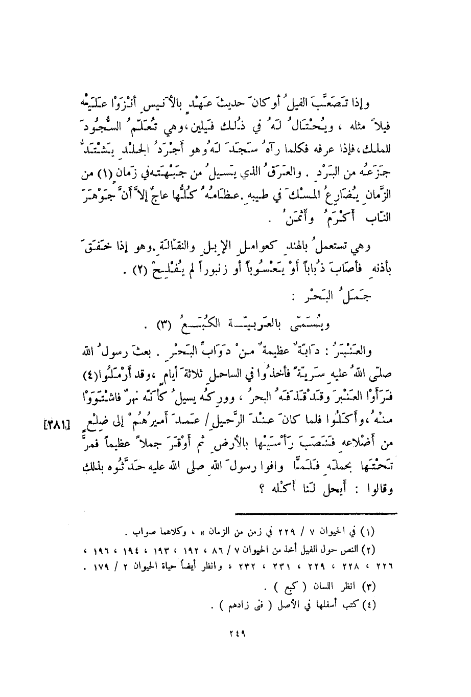وإذا تصعب الفيل أو كان حديث العهد بالأنيس أنزوا عليه فيلاً مثله، ويحتال له في ذلك فيلين، وهي تعلم السجود للملك، فإذا عرفه فكلما رآه سجد له وهو أجرد الجلد يشتد جزعه من البرد. والعرق الذي يسيل من جبهته في زمان من الزمان يضارع المسك في طيبه. عظامه كلها عاج إلا أن جوهر الناب أكرم وأثمن.