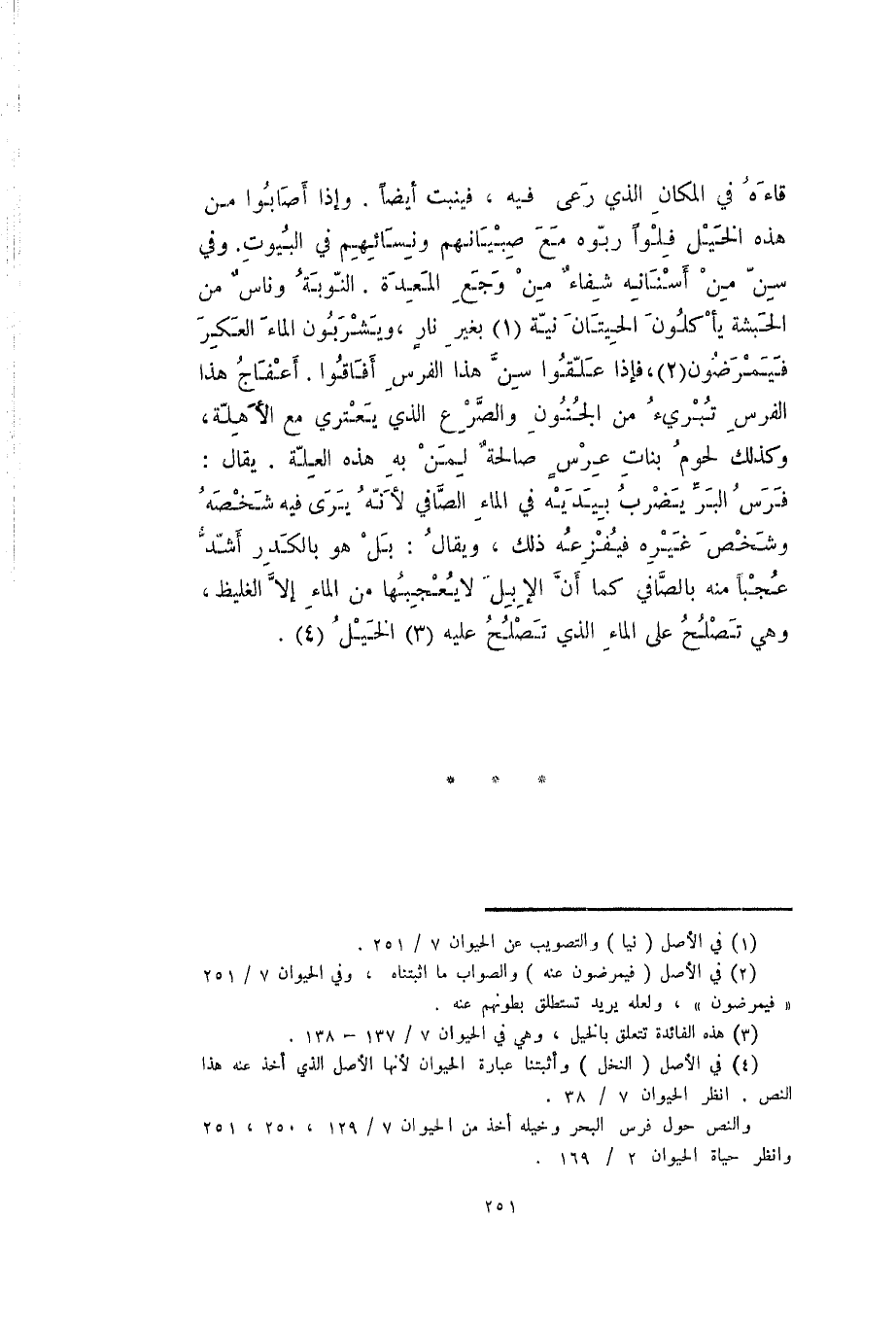 قاءه في المكان الذي رعى فيه، فينبت أيضاً، وإذا أصابوا من هذه الخيل فلواً ربوه مع صبيانهم ونسائهم في البيوت، وفي سن من أسنانه شفاء من وجع المعدة. النوبة وناس من الحبشة يأكلون الحيتان نية بغير نار، ويشربون الماء العكر فيمرضون، فإذا علقوا سن هذا الفرس أفاقوا. أعفاج هذا الفرس تبرئ من الجنون والصرع الذي يعتري مع الأهلة، وكذلك لحوم بنات عرس صالحة لمن به هذه العلة. يقال: فرس البر يضرب بيديه في الماء الصافي لأنه يرى فيه شخصه وشخص غيره فيفزعه ذلك، ويقال: بل هو بالكدر أشد عجباً منه بالصافي كما أن الإبل لا يعجبها من الماء إلا الغليظ، وهي تصلح على الماء الذي تصلح عليه الخيل.