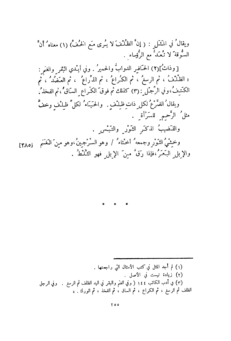 [وذات] الحافر الدواب والحمير. وفي أيدي البقر والغنم: "الظلف، ثم الرسغ، ثم الكراع، ثم الذراع، ثم العضد، ثم الكتف، وفي الرجل: كذلك فوق الكراع الساق، ثم الفخذ.