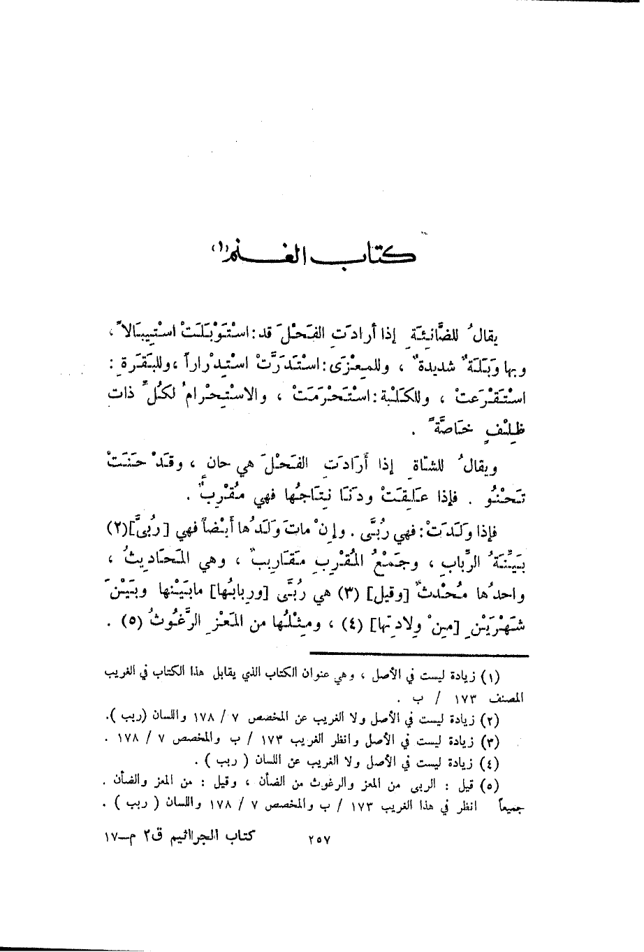 فإذا ولدت: فهي ربي. وإن مات ولدها أيضاً فهي [ربي] بينة الرباب، وجمع المقرب مقاريب، وهي المحاديث، واحدها محدث [وقيل] هي ربي [وربابها] ما بينها وبين شهرين [من ولادتها] ، ومثلها من المعز الرغوث.