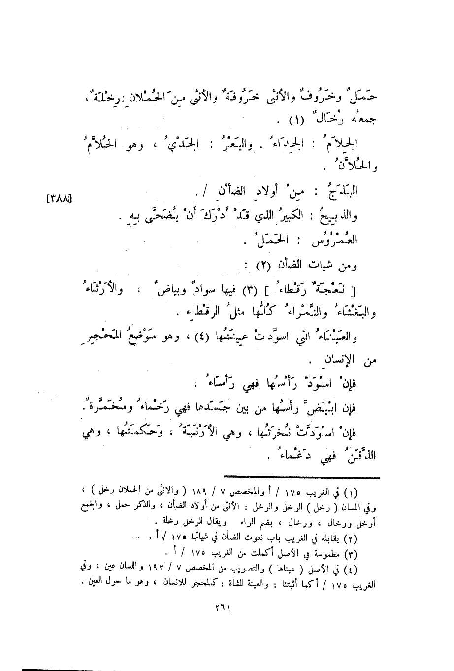 ومن شيات الضأن: [نعجة رقطاء] فيها سواد وبياض، والأرثاء والبغثاء والنمراء كلها مثل الرقطاء.