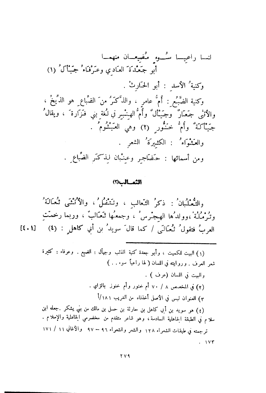 والثعلبان: ذكر الثعالب، وتتفل، والأنثى ثعالة وترملة، وولدها الهجرس، وجمعها ثعالب، وربما رخمت العرب فتقول ثعالى: مكما قال سويد بن أبي كاهل: