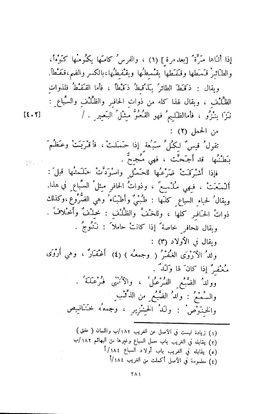 فإذا أشرقت ضرعها للحمل واسودت حلمتها قيل: ألمعت، فهي ملمع، وذوات الحافر مثل السباع في هذا. ويقال لحياء السباع كلها: طبي وأطباء وهي الضروع، وكذلك ذوات الخافر كلها، وللخف والظلف: خلف وأخلاف.