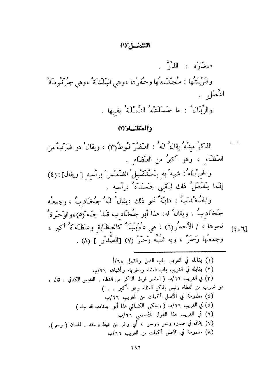 صغاره: الذر وقريتها: مجتمعها وحفرها، وهي البلدة، وهي جرثومة النمل.