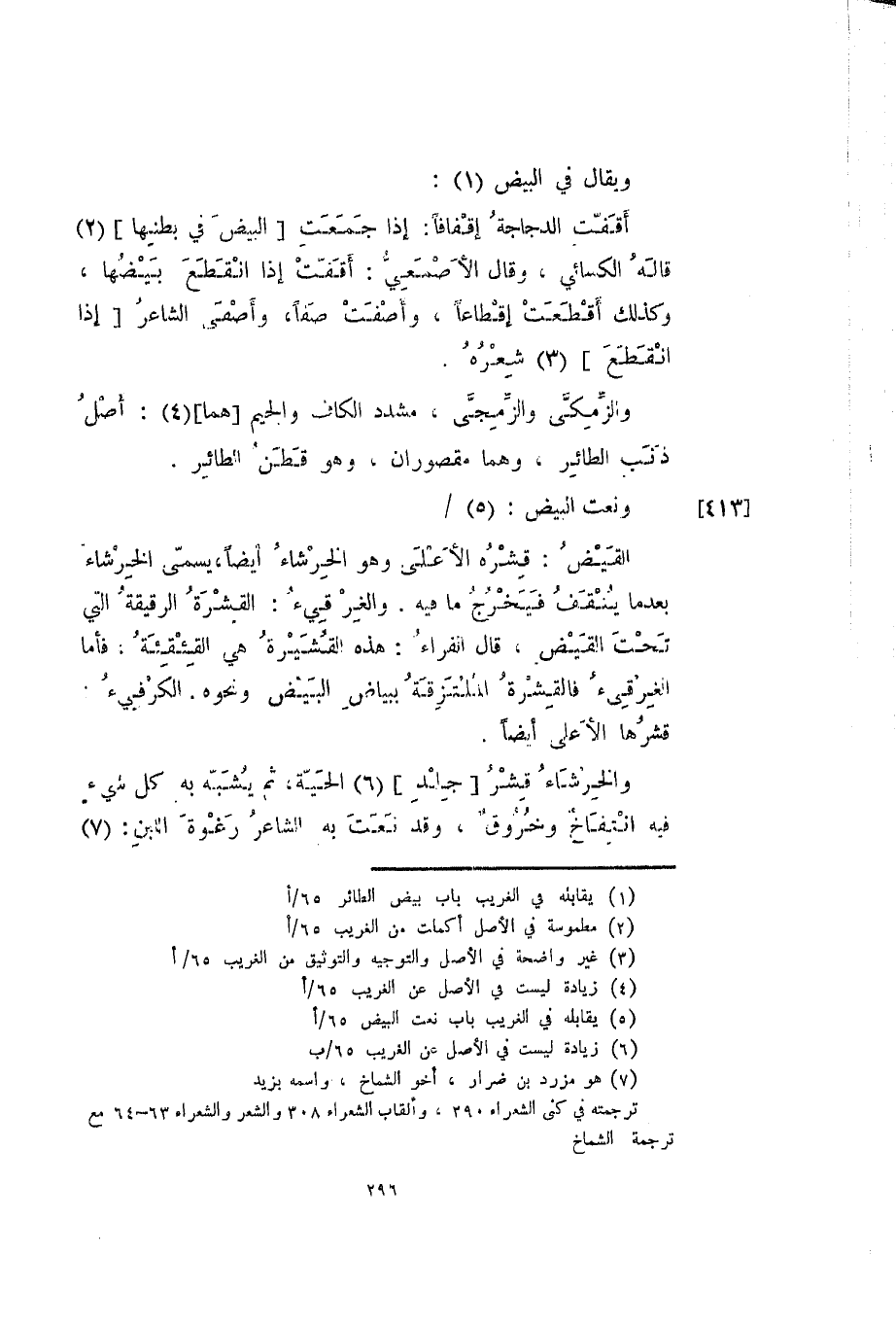 ونعت البيض: القيض: قشره الأعلى وهو الخرشاء ايضاً، يسمى الخرشاء بعدما ينقف فيخرج ما فيه. والفرقيء: القشرة الرقيقة التي تحت القيض، قال الفراء: هذه القشير هي القئقئة، فأما الفرقيء فالقشرة الملتزقة ببياض البيض ونحوه. الكرفيء قشرها الأعلى أيضاً.