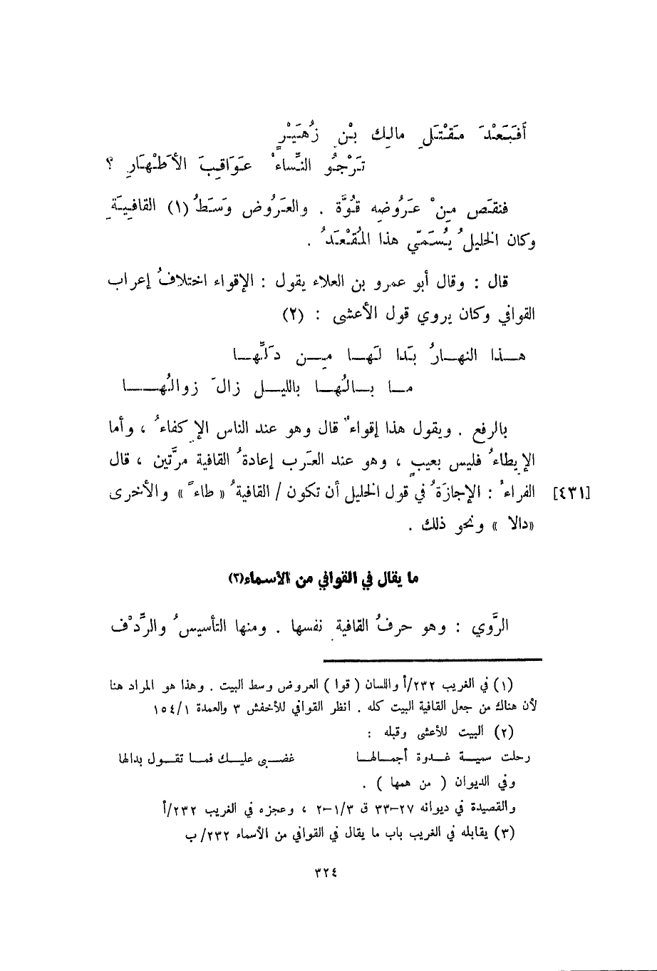 بالرفع. ويقول هذا إقواء قال وهو عند الناس الإكفاء، وأما الإيطاء فليس بعيب، وهو عند العرب إعادة القافية مرتين، قال الفراء: الإجازة في قول الخليل أن تكون القافية "طاء" والأخرى "دالاً" ونحو ذلك.