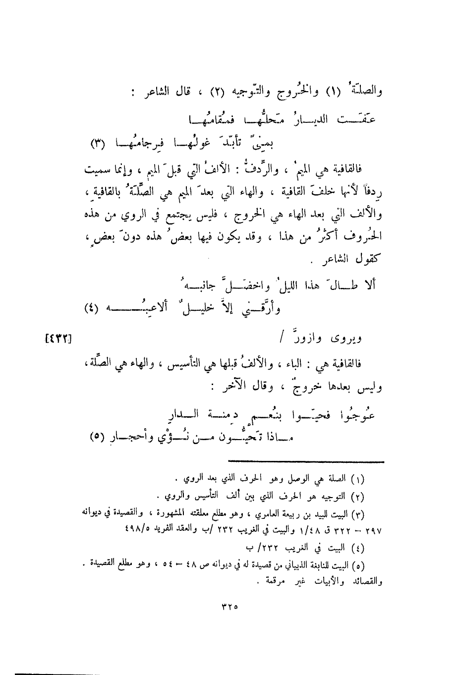 فالقافية هي الميم، والردف: اللف التي قبل الميم، وإنما سميت ردفاً أنها خلف القافية، والهاء التي بعد الميم هي الصلة بالقافية، والألف التي بعد الهاء هي الخروج، فليس يجتمع في الرويس من هذه الحروف أكثر من هذا، وقد يكون فيها بعض هذه دون بعض كقول الشاعر: