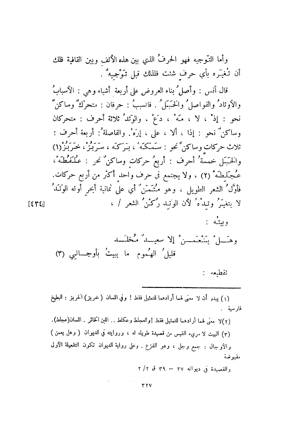وأما التوجيه فهو الحرف الذي بين هذه الألف وبين القافية فقلك أن تغيره بأي حرف شئت فلذلك قيل التوجيه.