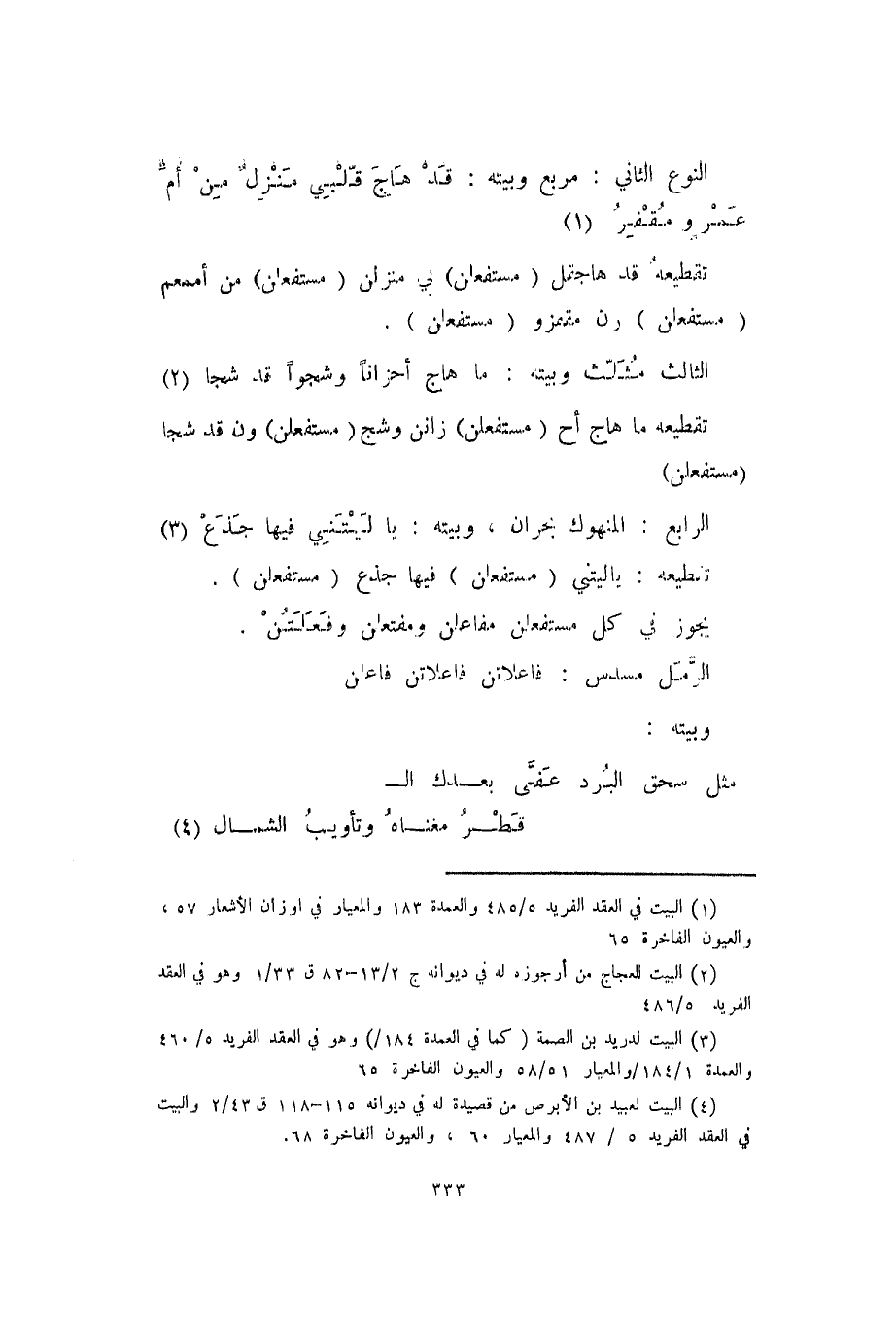 تقطيعه: ما هاج أح (مستفعلن) زانن وشج (مستفعلن) ون مقد شجا (مستفعلن) الرابع: المنهوك بحران، وبيته