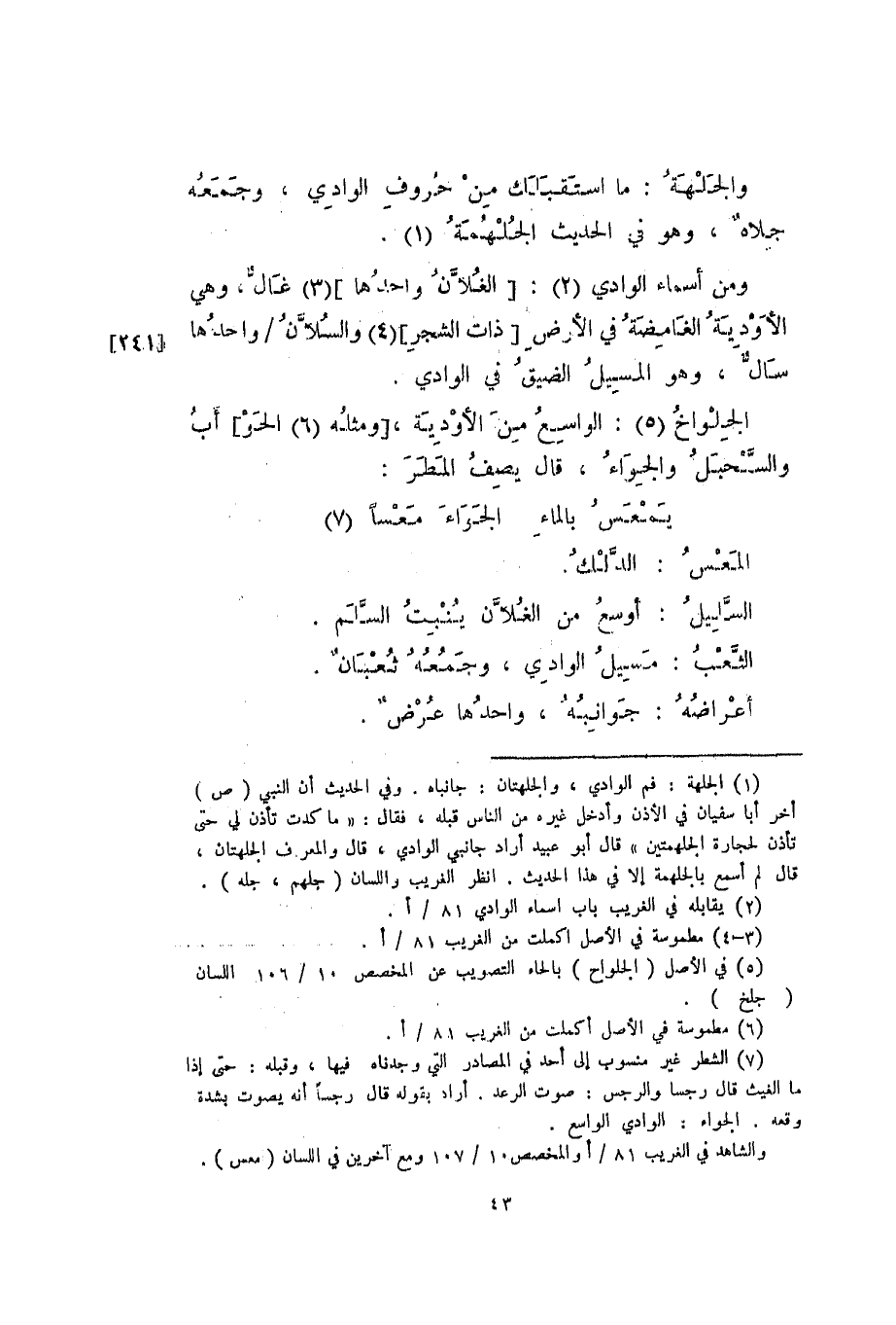 ومن أسماء الوادي: [الغلان واحدها] غال، وهي الأودية الغامضة في الأرض [ذات الشجر] والسلان واحدها سال، وهو المسيل الضيق في الوادي.