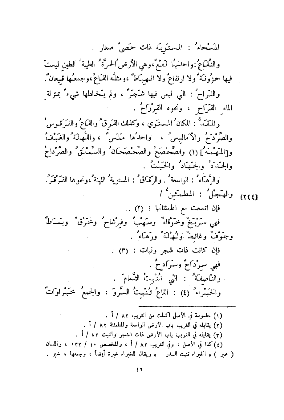 والمقد: المكان المستوي، وكذلك القرق والقاع والقرقوس والصردح والأماليس، واحدها ملس، واللهلة والغيف و [المهمه] والصحصح والصحصحان والسملق والصرداح والجدد والجهاد والخبت.
