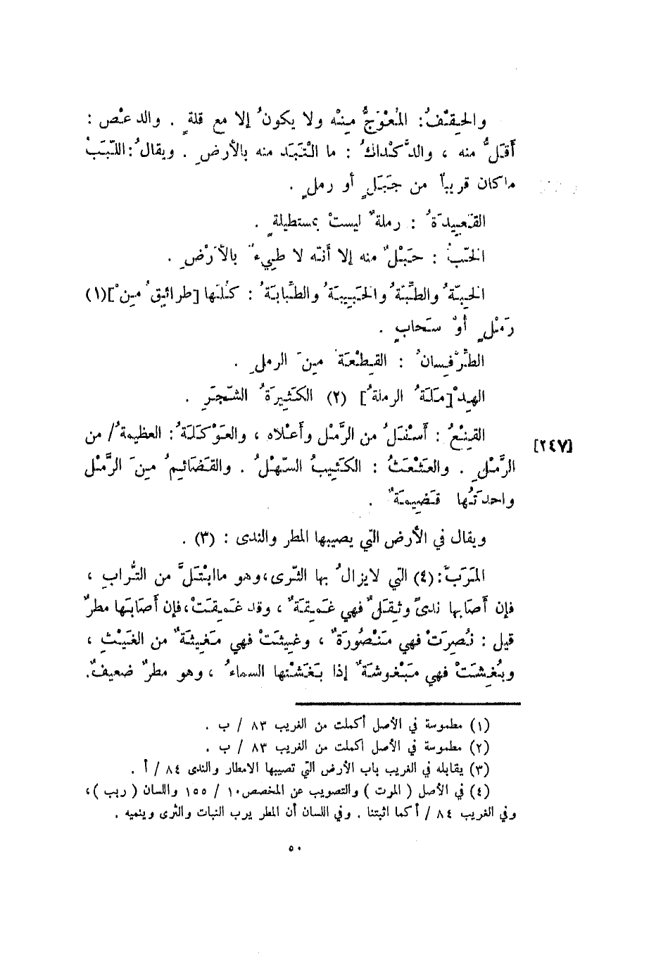 ويقال في الأرض التي يصيبها المطر والندى: المرب: التي لا يزال بها الثرى، وهو ما ابتل من التراب، فإن أصابها ندى وثقل فهي غمقة، وقد غمقت، فإن أصابها مطر قيل: نصرت فهي منصورة، وغيثت فهي مغيثة من الغيث، وبغشت فهي مبفوشة إذا بغشتها السماء، وهو مطر ضعيف.