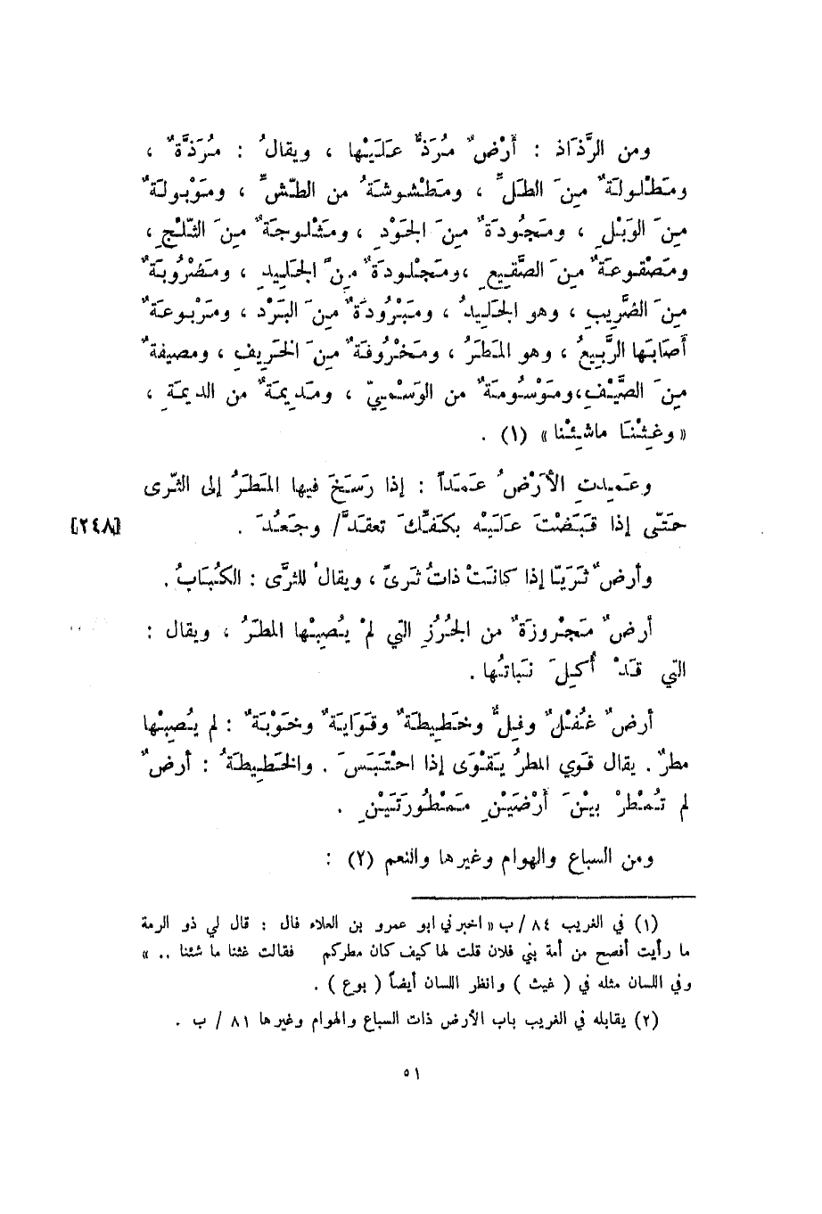 ومن الرذاذ: أرض مرذ عليها، ويقال: مرذة، ومطلولة من الطل، ومطشوشة من الطش، وموبولة من الوبل، ومجودة من الجود، ومثلوجة من الثلج، ومصقوعة من الصقيع، ومجلودة من الجليد، ومضروبة م الضريب، وهو الجليد، ومبرودة من البرد، ومربوعة أصابها الربيع، وهو المطر، ومخروفة من الخريف، ومصيفة من الصيف، وموسومة من الوسمي، ومديمة من الديمة، "وغثنا ما شئنا".