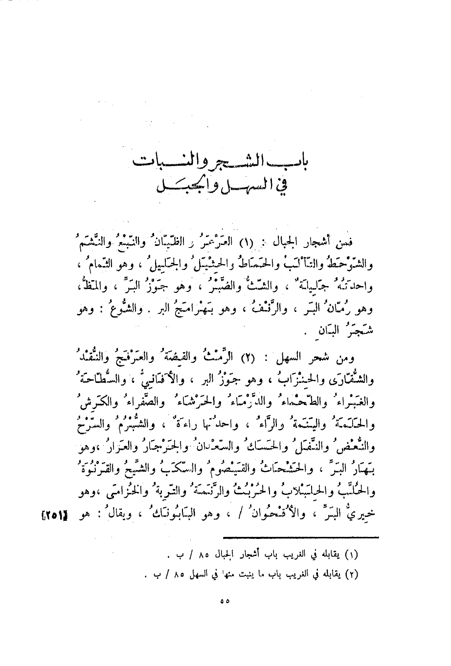 ومن شجر السهل: الرمث والقضة والعرفج والنقد والشقارى والحنزاب، وهو جوز البر، والأفاني، والسطاحة والغبراء والصحماء والدرماء والحرشاء والصفراء والكرش والحلمة والينمة والراء، واحدتها راءة، والشبرم والسرح والنعض والنفل والحسك والسعدان والجرجار والعرار، وهو بهار البر، والحثحات والقيصوم والسكب والشيح والقرنوة والحلب والحلبلاب والحربث والرنمة والتربة والخزامى، وهو خيري البر، والأقحوان، وهو البابونك، ويقال: هو